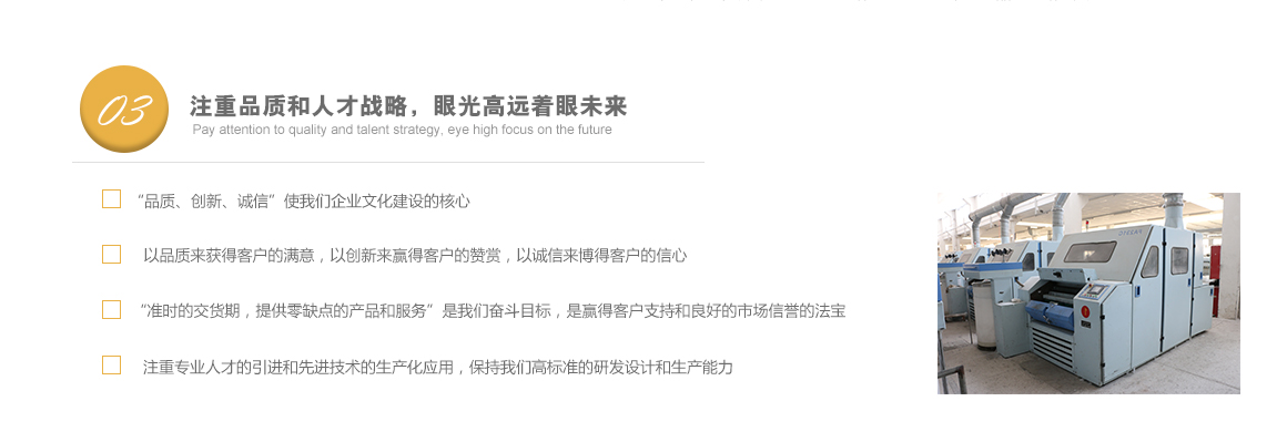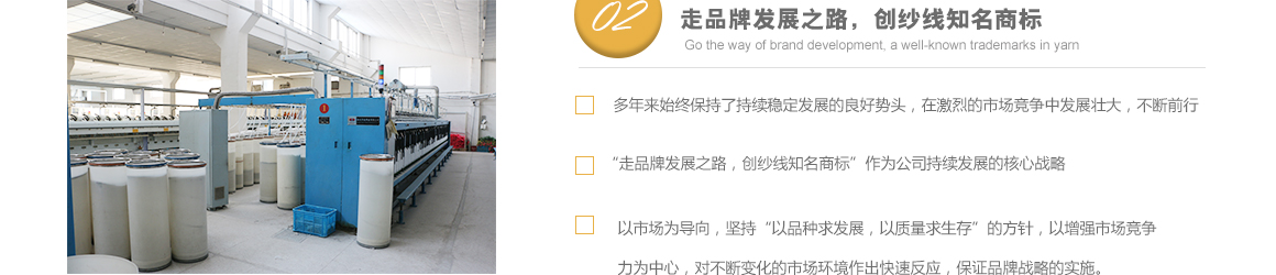 太倉(cāng)市高陽(yáng)工貿(mào)有限公司是專(zhuān)業(yè)從事特種紗生產(chǎn)十?dāng)?shù)年的一線(xiàn)生產(chǎn)廠(chǎng)家,坐落于江蘇省蘇州市太倉(cāng)市雙鳳鎮(zhèn)新湖建湖路29號(hào),太倉(cāng)隸屬長(zhǎng)江三角洲經(jīng)濟(jì)圈,交通便捷,經(jīng)濟(jì)發(fā)達(dá),是著名的紡織生產(chǎn)基地。 公司歷史要追溯到1982年就成立的新湖毛紡織廠(chǎng)。1996年,毛紡織廠(chǎng)與上海二十二棉在新湖聯(lián)合組建了太倉(cāng)市新湖福利綜合廠(chǎng)。2002年為適應(yīng)市場(chǎng)的飛速變化,公司轉(zhuǎn)制重組更名為太倉(cāng)市高陽(yáng)工貿(mào)有限公司。同時(shí)公司適時(shí)調(diào)整生產(chǎn)經(jīng)營(yíng)策略,調(diào)整產(chǎn)品品種結(jié)構(gòu),把生產(chǎn)特種紗作為主要發(fā)展方向,純棉、滌綸竹節(jié)紗是我們的主要產(chǎn)品。 公司多年來(lái)始終保持了持續(xù)穩(wěn)定發(fā)展的良好勢(shì)頭,在激烈的市場(chǎng)競(jìng)爭(zhēng)中發(fā)展壯大,不斷前行。我們把“走品牌發(fā)展之路,創(chuàng)紗線(xiàn)知名商標(biāo)”作為公司持續(xù)發(fā)展的核心戰(zhàn)略。以市場(chǎng)為導(dǎo)向,堅(jiān)持“以品種求發(fā)展,以質(zhì)量求生存”的方針,以增強(qiáng)市場(chǎng)競(jìng)爭(zhēng)力為中心,對(duì)不斷變化的市場(chǎng)環(huán)境作出快速反應(yīng),品牌戰(zhàn)略的實(shí)施。公司注重專(zhuān)業(yè)人才的引進(jìn)和先進(jìn)技術(shù)的生產(chǎn)化應(yīng)用,具備較強(qiáng)的研發(fā)設(shè)計(jì)和生產(chǎn)能力。 公司一直把“品質(zhì)、創(chuàng)新、誠(chéng)信”作為企業(yè)文化建設(shè)的核心。以品質(zhì)來(lái)獲得客戶(hù)的滿(mǎn)意,以創(chuàng)新來(lái)贏(yíng)得客戶(hù)的贊賞,以誠(chéng)信來(lái)博得客戶(hù)的信心。我們把“準(zhǔn)時(shí)的交貨期,提供零缺點(diǎn)的產(chǎn)品和服務(wù)”作為奮斗目標(biāo),贏(yíng)得了客戶(hù)的支持和良好的市場(chǎng)信譽(yù)。 高陽(yáng)工貿(mào)有限公司愿與廣大客戶(hù)加強(qiáng)合作,共享信息,迎接挑戰(zhàn),共同發(fā)展??蛻?hù)需求。了解詳細(xì)>>
